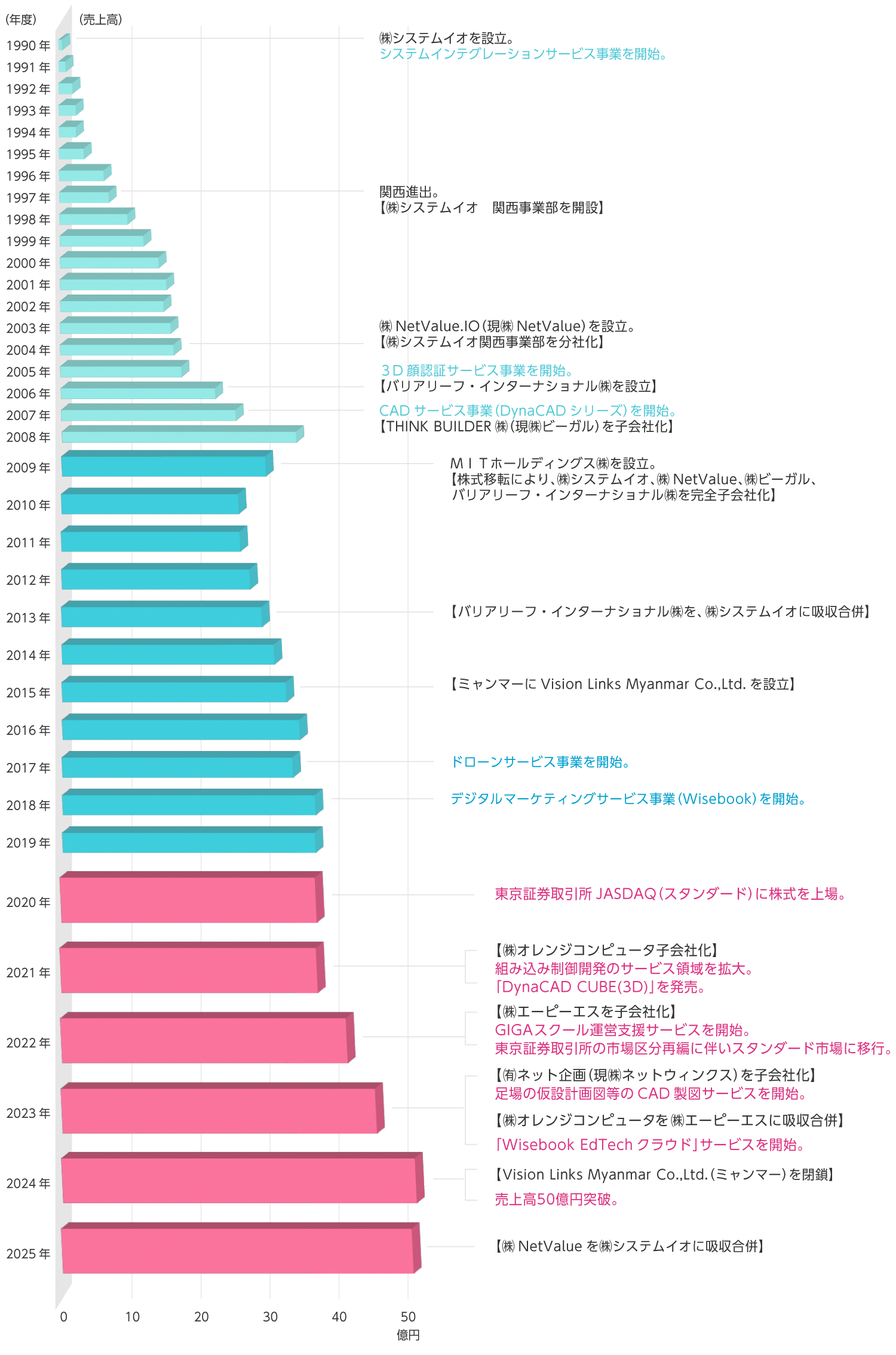 1990年に株式会社システムイオを設立してから現在までのMITホールディングス連結売上高推移と